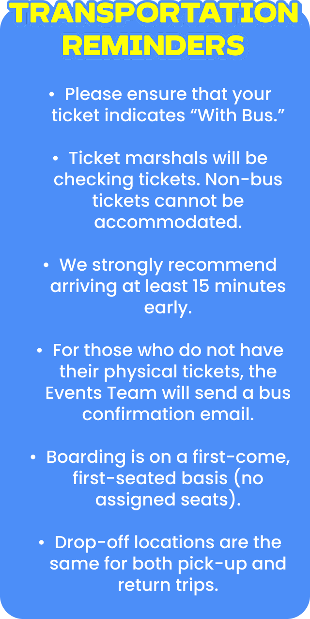 11:30 AM – 12:00 NN2 buses will be leaving at 11:30 AM and 12:00 NN. |